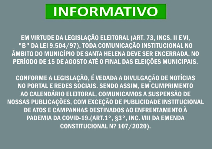 A Prefeitura de Sousa, por meio da Secretaria de Comunicação, comunica que as publicações dos atos desta entidade estão suspensas temporariamente em função da Legislação Eleitoral (Lei 9.504 de 30 de setembro de 1997). A exceção é para divulgação das informações de necessidade pública como a pandemia do novo Coronavírus, de acordo com a Emenda Constitucional 107.